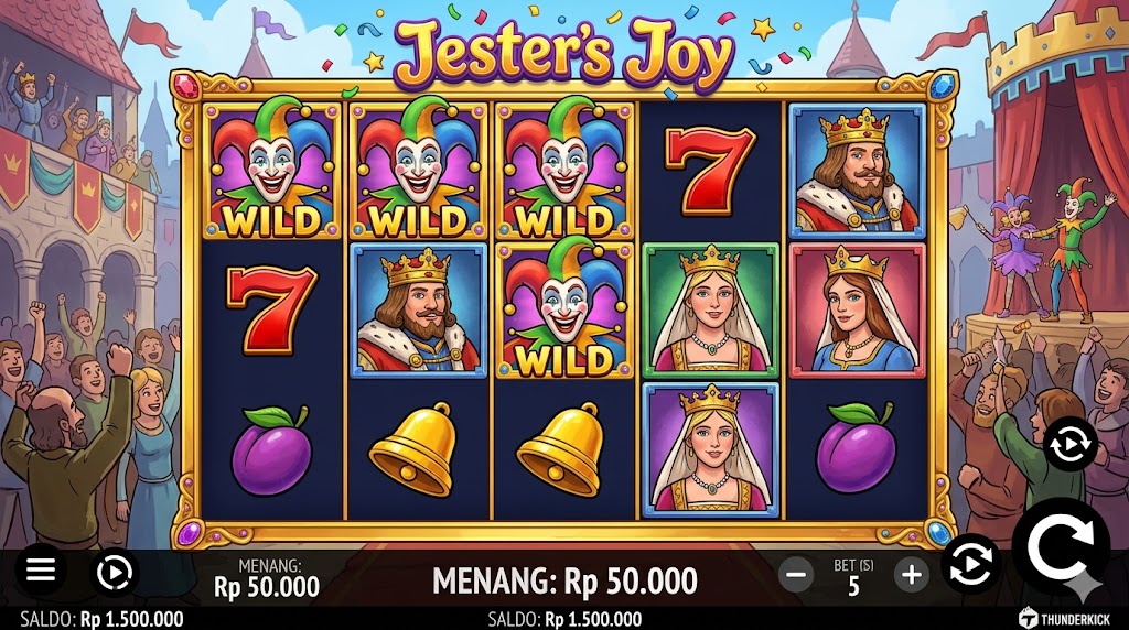 Salah satu kekuatan utama game ini adalah gaya visualnya yang sangat khas. Thunderkick dikenal dengan desain artistik, dan Jester’s Joy Slot adalah salah satu contoh terbaiknya.