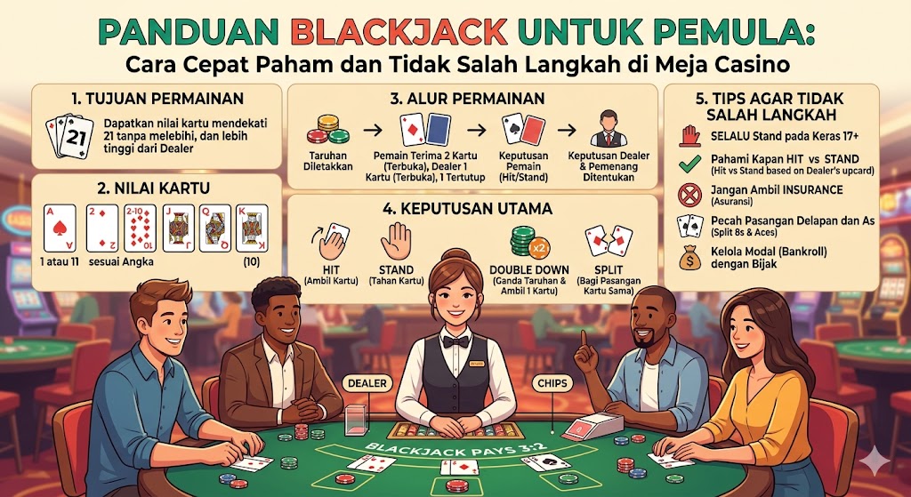 Panduan blackjack untuk pemula dimulai dari memahami aturan dasar, mengenal istilah penting, menggunakan basic strategy, serta mengelola modal dengan disiplin. Dengan pendekatan yang benar, pemain baru dapat berkembang secara bertahap tanpa harus mengalami kerugian besar di awal perjalanan.